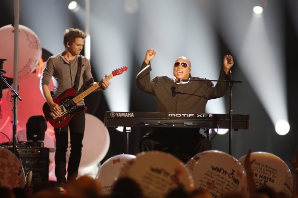 Stevie Wonder & Hunter Hayes during a performance at the 48th Academy of Country Music Awards.