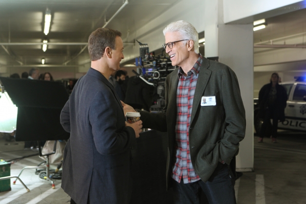 There’s nothing like a cup of coffee between friends Gary Sinise (left) and Ted Danson (right) have a little fun on set in this behind-the scenes shot. Photo: Monty Brinton/CBS ©2012 CBS Broadcasting, Inc. All Rights Reserved.