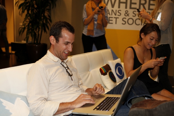 Exeutive Producer Nick Wootton and Stella Maeve having fun live tweeting in the CBS Tweet Week Lounge.