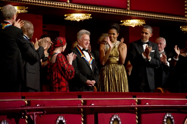 Pictured L-R: David Letterman, Buddy Guy, Natalia Makarova, Dustin Hofman, Lady Michelle Obama, and President Barack Obama. Photo: John Paul Filo/CBS ©2012 CBS Broadcasting, Inc. All Rights Reserved.