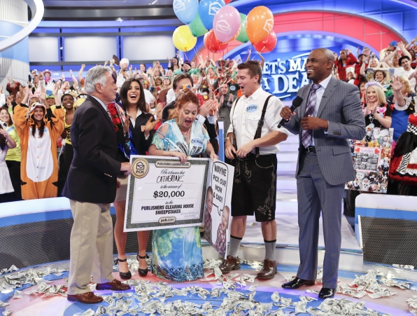It’s another winner as Catherine Biermann of Burbank, CA celebrates, when Publishers Clearing House visits LET'S MAKE A DEAL for a special week of giveaways airing May 10 (check local listings) on the CBS Television Network. Photo: Cliff Lipson/CBS ©2013 CBS Broadcasting, Inc. All Rights Reserved.