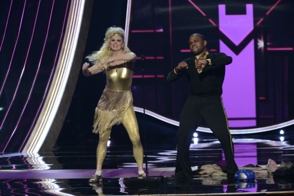 Actors Monica Potter and Anthony Anderson perform a skit at the 39th annual People's Choice Awards. Photo Credit: Monty Brinton/CBS.