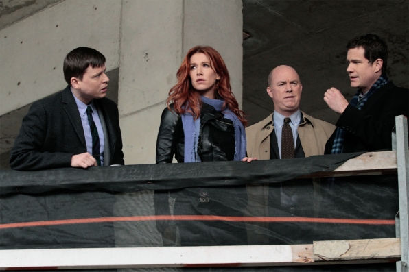 (L to R) Roe (Kevin Rankin), Carrie (Poppy Montgomery), Mike (Michael Gaston) and Al (Dylan Walsh) investigate the murder of a construction worker with a promising future. Photo: Giovanni Rufino/CBS ©2011 CBS Broadcasting Inc. All Rights Reserved. #Unforgettable